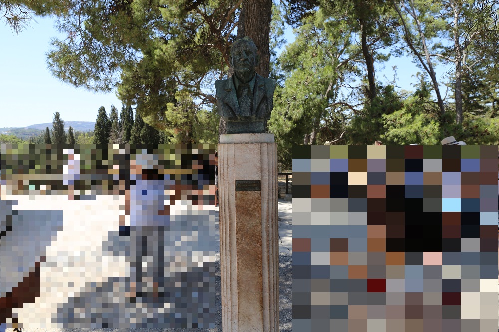 크노소스 궁전 입구에 보면, 어울리지 않는 동상이 하나 있는데요. 그 만큼 중요하니까 있겠지요. 이 동상은 영국의 고고학자인 아서 에반스를 기념하는데요. 아서 에반스는 공공박물관의 시초라고 알려진 영국의 애슈몰린 박물관의 관장을 했던 분으로, 신화로만 여겨졌만 크레타섬의 미노스 문명을 발견했기 때문에 크노소스 궁전 초입에 똭 이렇게 이 분의 동상이 자리를 잡고 있는 것입니다.