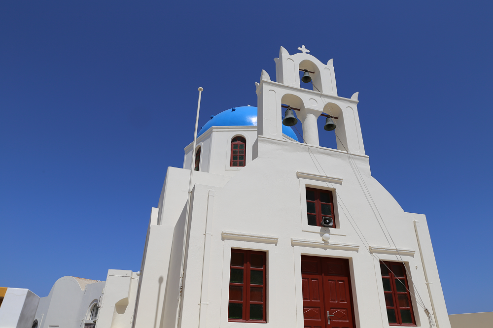 산토리니 섬은 우리나라의 울릉도 정도되는 섬이라고 알려져 있다고 하는데요. 그 중에서도 관광객들이 아주 많이 다니는 관광지 중의 하나가 피라(Fira)입니다. 아마도 눈에 익고 "아 저기"라고 할 만한 곳이 바로 저 건물인데요. 저 건물 이름은 그리스 가톨릭교회인 피라의 삼종(?, three bells of Fira)라고 합니다.